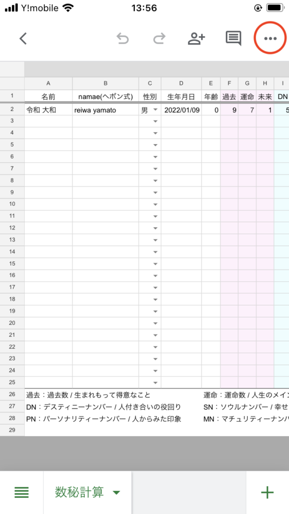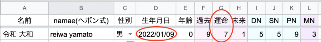 右側に年齢と、数秘の各項目が自動で計算されます。